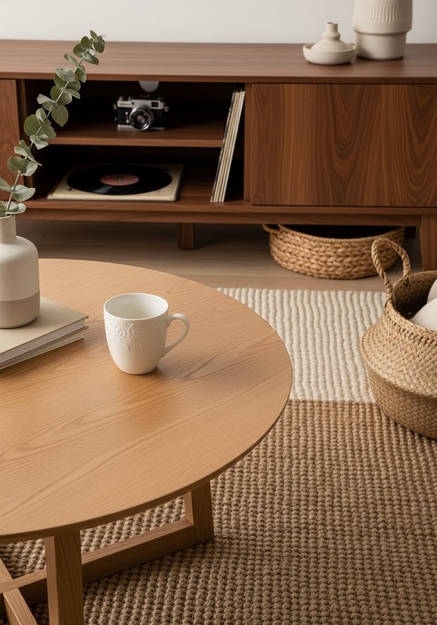I stopped returning wood pieces that didn't match and started mixing tones. The result felt layered and thrifted instead of showroom. A light table, medium shelf, and one dark chair create personality without chaos.