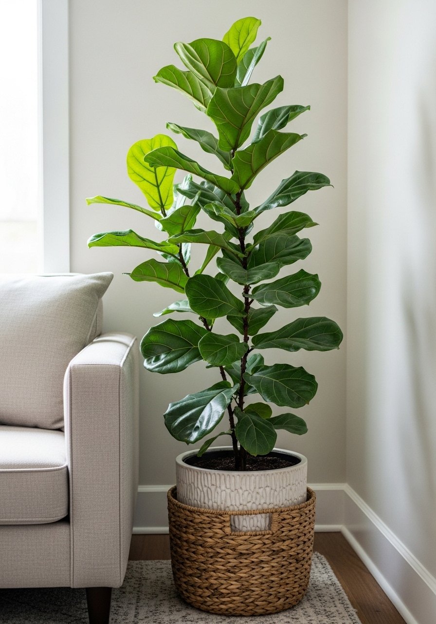 I killed an expensive fiddle leaf fig by overwatering once. Choose resilient species for busy homes, and use a well-draining pot. A tall plant in a woven basket reads intentional and softens corners.