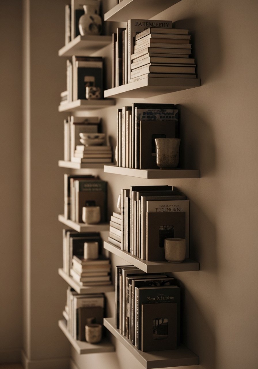 I installed narrow vertical shelves and they drew the eye upward. They hold a few books and ceramics and feel like built-ins. The wall reads purposeful instead of blank.