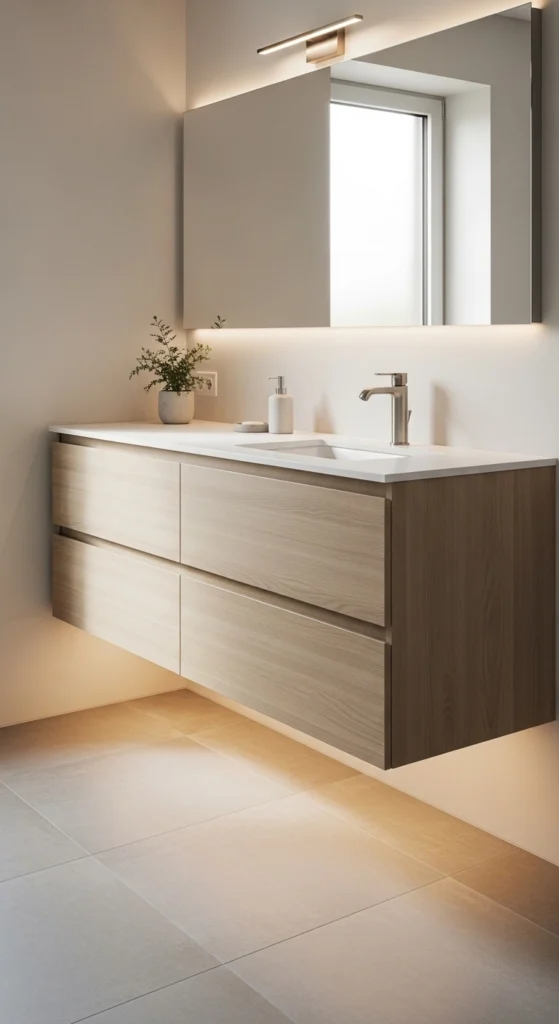 Floating vanities change how a bathroom feels the moment you install one. Seeing more floor instantly makes the room appear larger. This works especially well in narrow or shared bathrooms. You can buy wall-mounted units or adapt an existing vanity by removing the legs and securing it properly. The open space underneath is easy to clean and helps light move through the room.