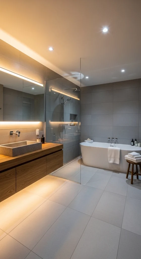 Lighting sets the mood more than any single decor item. A spa-like bathroom uses layers instead of one bright ceiling light. Wall sconces near the mirror reduce harsh shadows. Soft LED strips under vanities or shelves add glow without glare.