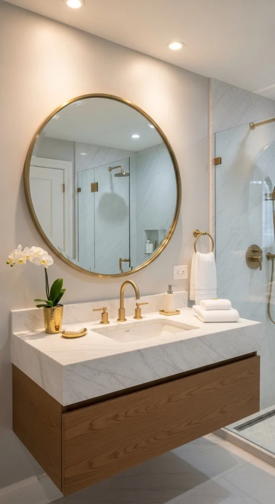 Straight lines dominate most bathrooms. Adding curves brings softness and visual ease. Rounded mirrors, curved basins, and arched shelves feel gentle and inviting.