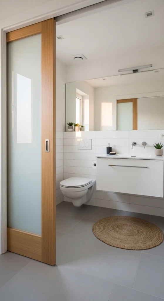 Choose neutral tiles with subtle texture. Budget-friendly ceramic tiles work well. Keep fixtures simple so the tile remains the focus. This method simplifies the room visually and feels cohesive.