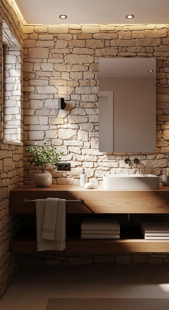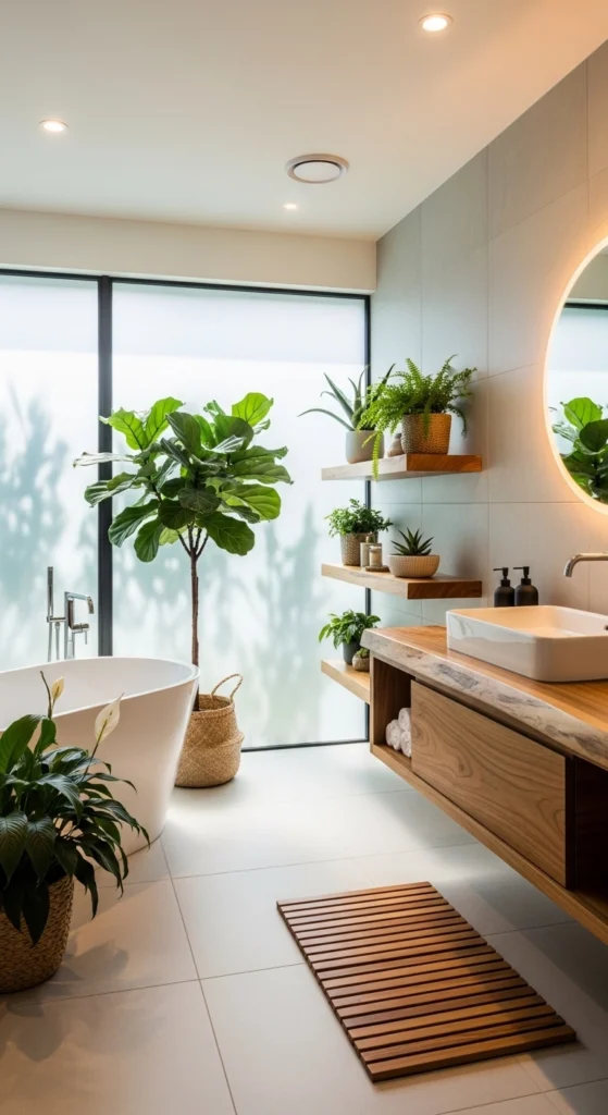 If natural light is limited, use high-quality faux plants. Choose realistic textures and avoid shiny plastic leaves. Place plants near mirrors or tubs where they feel intentional. Pair greenery with wood or stone accents for a balanced look. Plants do not require renovation but change the atmosphere instantly.