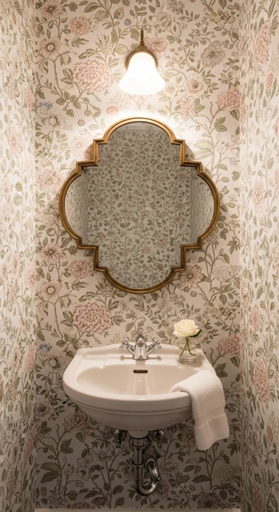 Peel-and-stick wallpaper works well for renters or short-term updates. Install it behind the sink or on the main wall for impact. Balance bold walls with simple fixtures so the space does not feel crowded. A plain white sink and neutral floor help ground the look. Wallpaper turns a simple room into a design moment without tools or demolition.