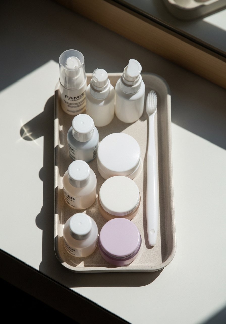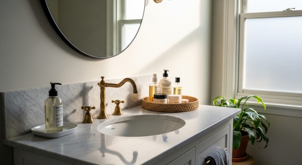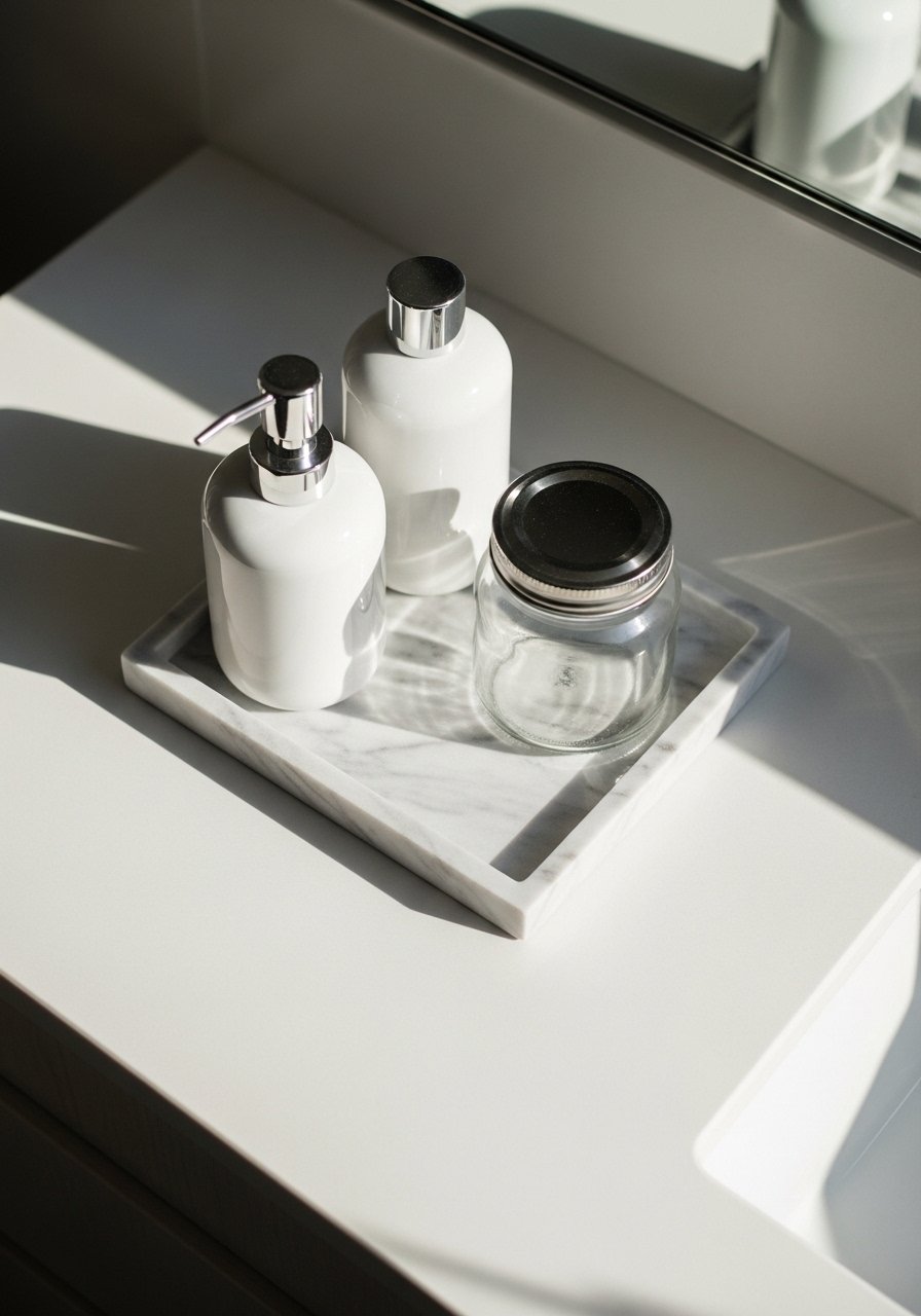 Trays are the easiest way to look tidy. I group daily products on one tray using odd numbers and varied heights, tall bottle, medium jar, short dish. That height variation reads better in photos and in person. Budget $15 to $60. Avoid clear plastic trays that scratch and look cheap. My favorite is a marble vanity tray. Use trays for daily items only. Otherwise they become a drop zone and defeat the purpose.