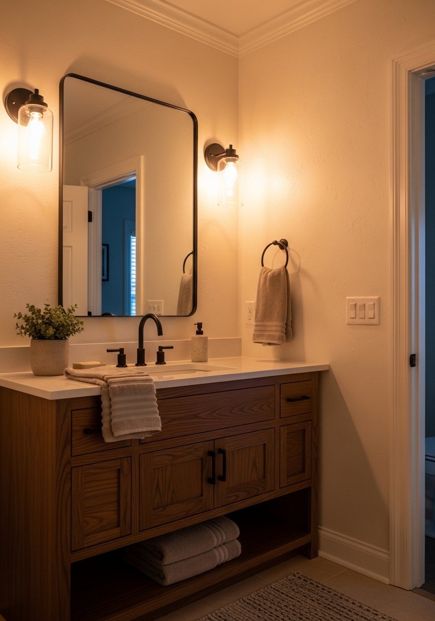 Under-cabinet strip lighting makes late-night trips easier and looks modern. I set mine on a dimmer so it is not harsh. Budget $20-$60. A common mistake is installing bright white strips that feel clinical. Pick warm white and a diffuser. I bought warm LED strip lights. Test the adhesive on your vanity finish before committing.