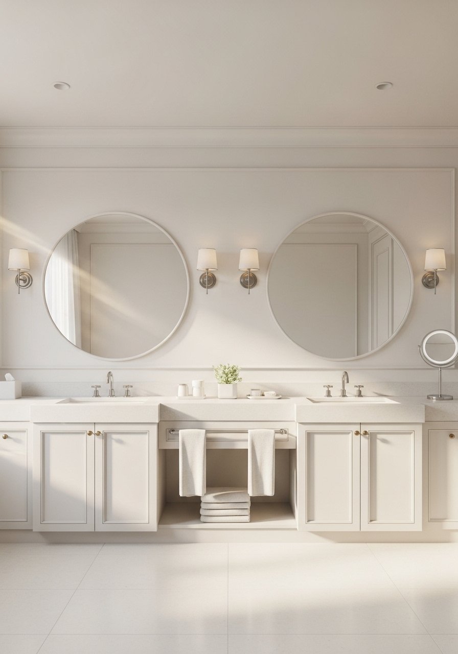 Symmetry creates calm at a double vanity. I positioned two mirrors so their bottoms sit 6 inches above the backsplash. That spacing keeps them proportional to standard 36-inch counters. Works best in modern, transitional, or classic bathrooms. Budget $60-$250 per mirror. A common error is hanging mirrors too high. It makes the room feel top-heavy. I recommend 36-inch round mirrors for standard-height people and 30-inch versions for lower ceilings. Mirrors with thin frames avoid visual bulk.