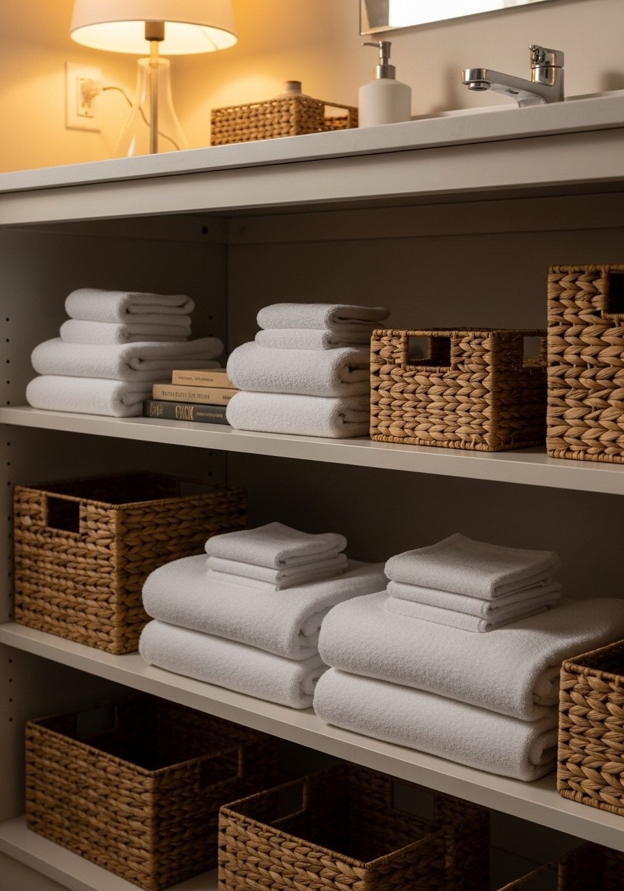 I swapped cabinet doors for open shelving on one vanity and never looked back. Display two rows of towels and three baskets for storage. The rule I use is odd numbers again, so three baskets look better than two. Budget $30-$200 depending on material. The main pitfall is using too many small baskets. That looks cluttered. Choose baskets in the same material family. I like woven seagrass baskets because they hide toiletries and breathe. In a large bathroom scale up the shelf height, in a small one keep shelves shallow so the toe space stays usable.