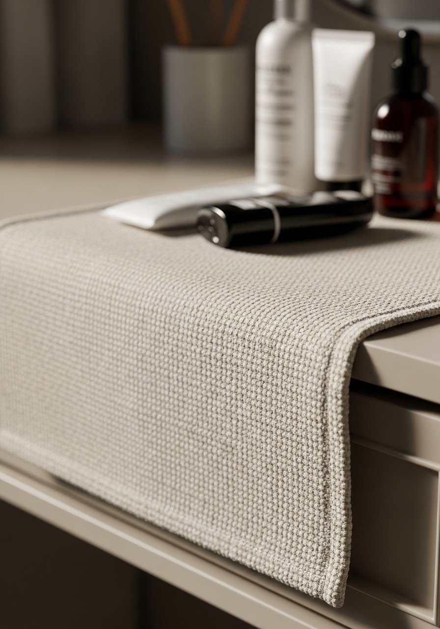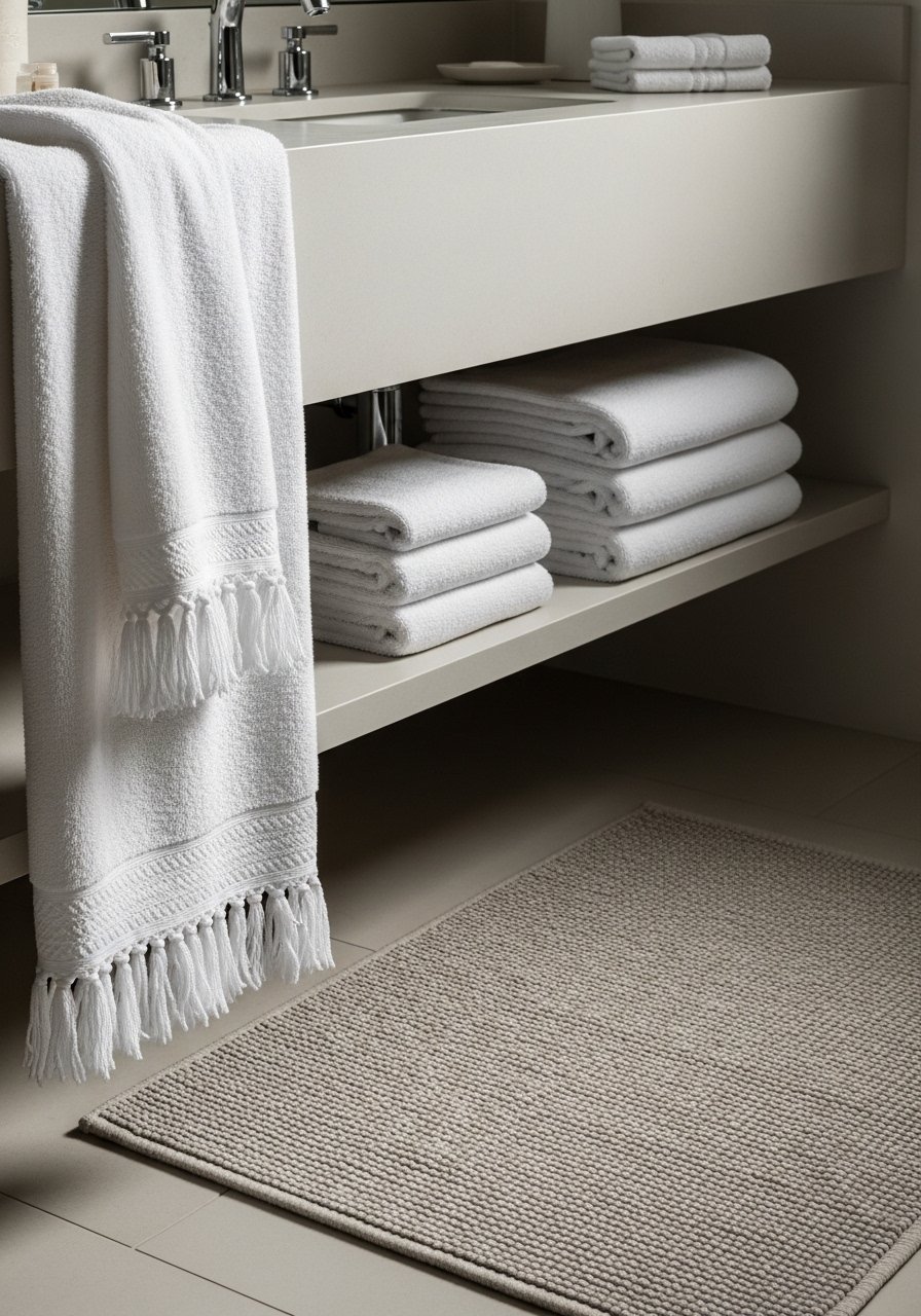 A small textured rug plus a stack of waffle towels changes the mood from clinical to lived-in. I place the rug so 60 percent is underfoot and 40 percent under the vanity. That fraction keeps it functional and prevents curling. Budget $20-$80. The common mistake is picking a rug with a busy pattern that clashes with tile. Stick to neutrals or a single accent color. I bought waffle towels in stone gray and they hide dampness well. In photos shag rugs read cozy. In bathrooms they trap moisture. Choose low-pile options.
