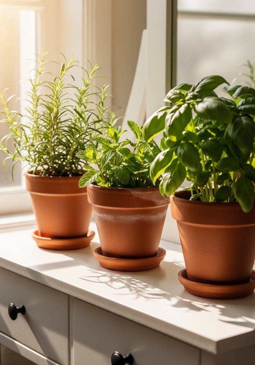 Real herbs on the sill give a fresh scent and a pop of green. A small grouping of three pots works for light-filled bathrooms. I recommend herbs like mint or rosemary since they tolerate humidity. Budget $12-$40. The mistake is using large, heavy pots that block light. Use slim terracotta or ceramic pots. I picked small terracotta pots that fit the sill. If your bathroom lacks natural light, go faux and choose a realistic faux eucalyptus.