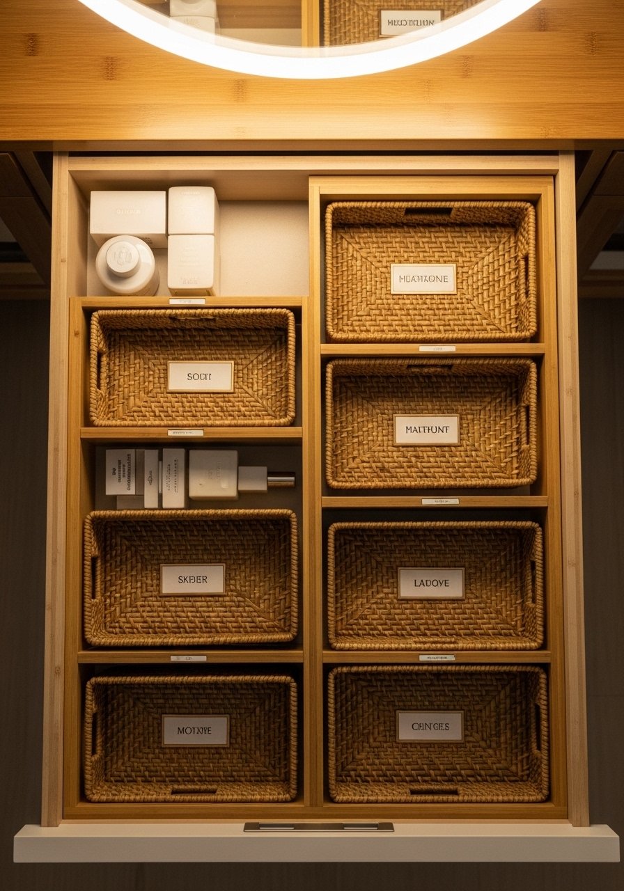 Drawer organizers keep daily grooming on schedule. I use adjustable bamboo dividers and small baskets to hold hair ties, razors, and electronics. The key rule is one category per compartment. Budget $15-$40. People cram mixed items into one drawer and then declare organizers useless. That error is common. I recommend bamboo drawer dividers. For makeup, use shallow inserts so brushes lie flat and lashes stay intact.
