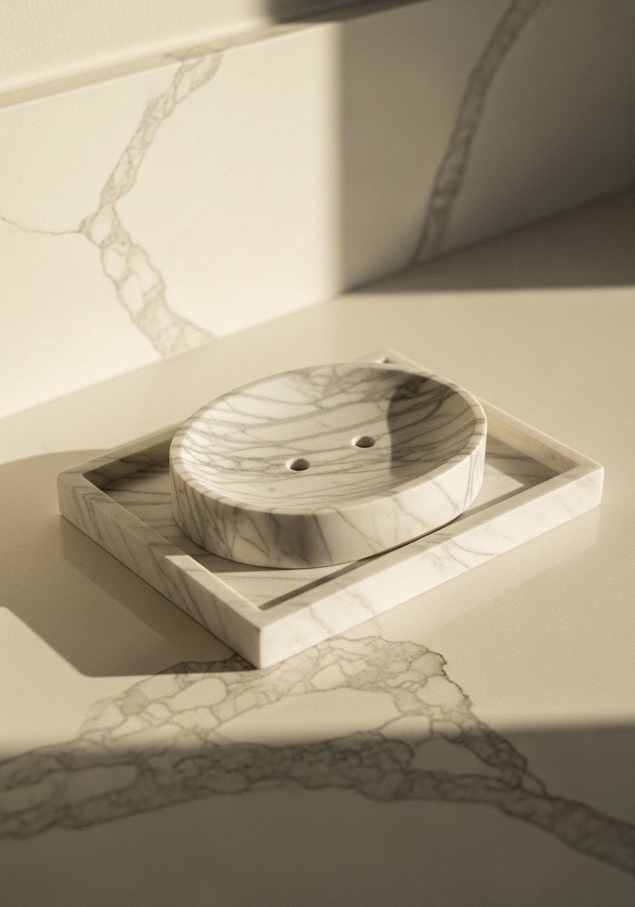 You can get luxe effects by adding stone accents rather than replacing a whole countertop. A marble tray and soap dish add the feel of quality. I look for true stone pieces, not printed plastic. Budget $25-$100. The common cheap mistake is buying printed faux-marble that peels. I invested in a real marble soap dish and it still looks good after a year. Pair marble with warm wood or brass to avoid a cold feel.