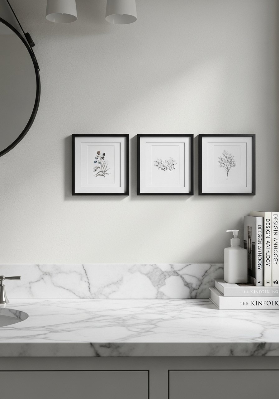 A small gallery over a single sink adds personality without cluttering the countertop. I group three frames at eye level with unequal spacing, about 2 to 3 inches apart. Budget $10-$60 for prints and frames. People often choose frames that are too large for the wall. Smaller prints encourage closeness and feel curated. I used white picture mats and frames and mixed vintage frames from thrift stores. In photos a gallery looks polished. In real life poor hanging height ruins it.