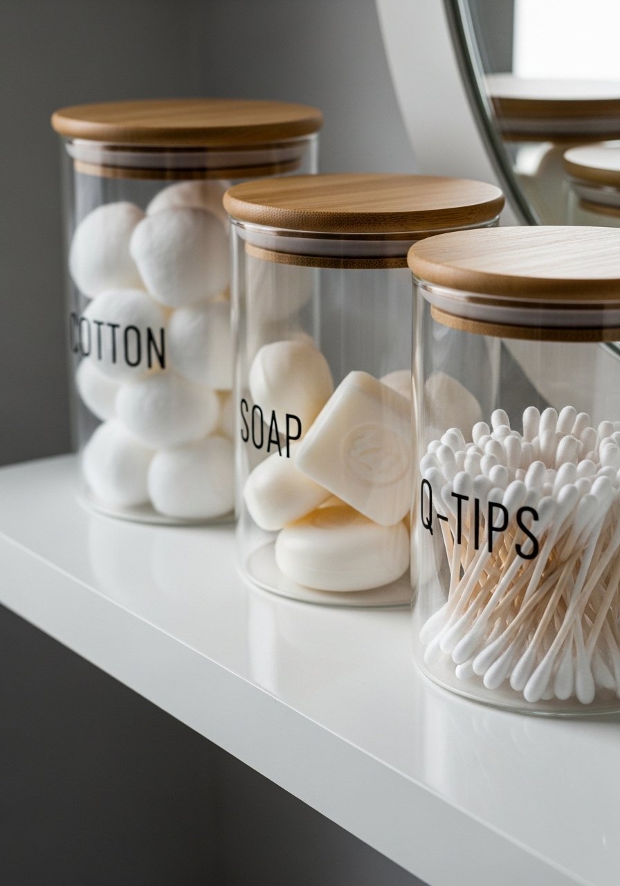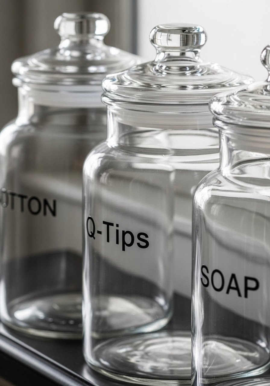 Clear apothecary jars make supplies accessible and pretty. Label them with simple sans-serif text to avoid a homemade look. Budget $20-$45. The mistake is over-labeling or using ornate fonts that look dated. I bought glass canisters with bamboo lids and labeled 'Cotton' and 'Q-Tips' in black. In photos everything is tidy. In real life lids must fit well to keep moisture out, so check dimensions.
