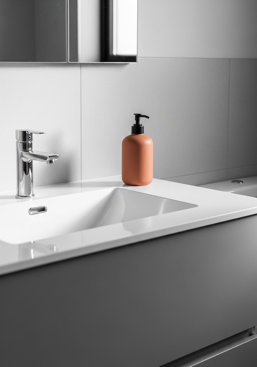 Monochrome palettes feel calm and cohesive. I stick to whites and grays, then add a terracotta pump for contrast. Keep the accent to about 10 percent of visible items. Budget $10-$80. A common error is adding too many accent pieces. The accent must be deliberate. For example, use a terracotta soap dispenser and a matching toothbrush cup only. Large bathrooms can carry more color. Small ones should be more restrained.
