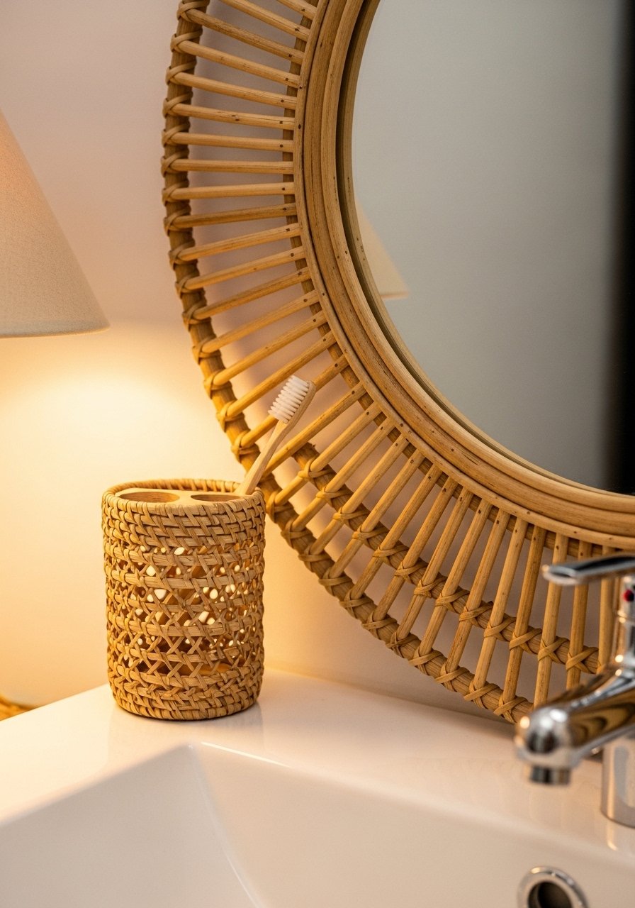 Rattan warms a sleek sink setup and adds texture. I add one rattan element, like a mirror or tray, so it reads intentional. Budget $20-$120. Rattan that is too fragile looks cheap after a few months in humidity. Choose sealed or treated pieces. I use a rattan tray and it resists moisture well. Pair rattan with cool stone to keep the look balanced.