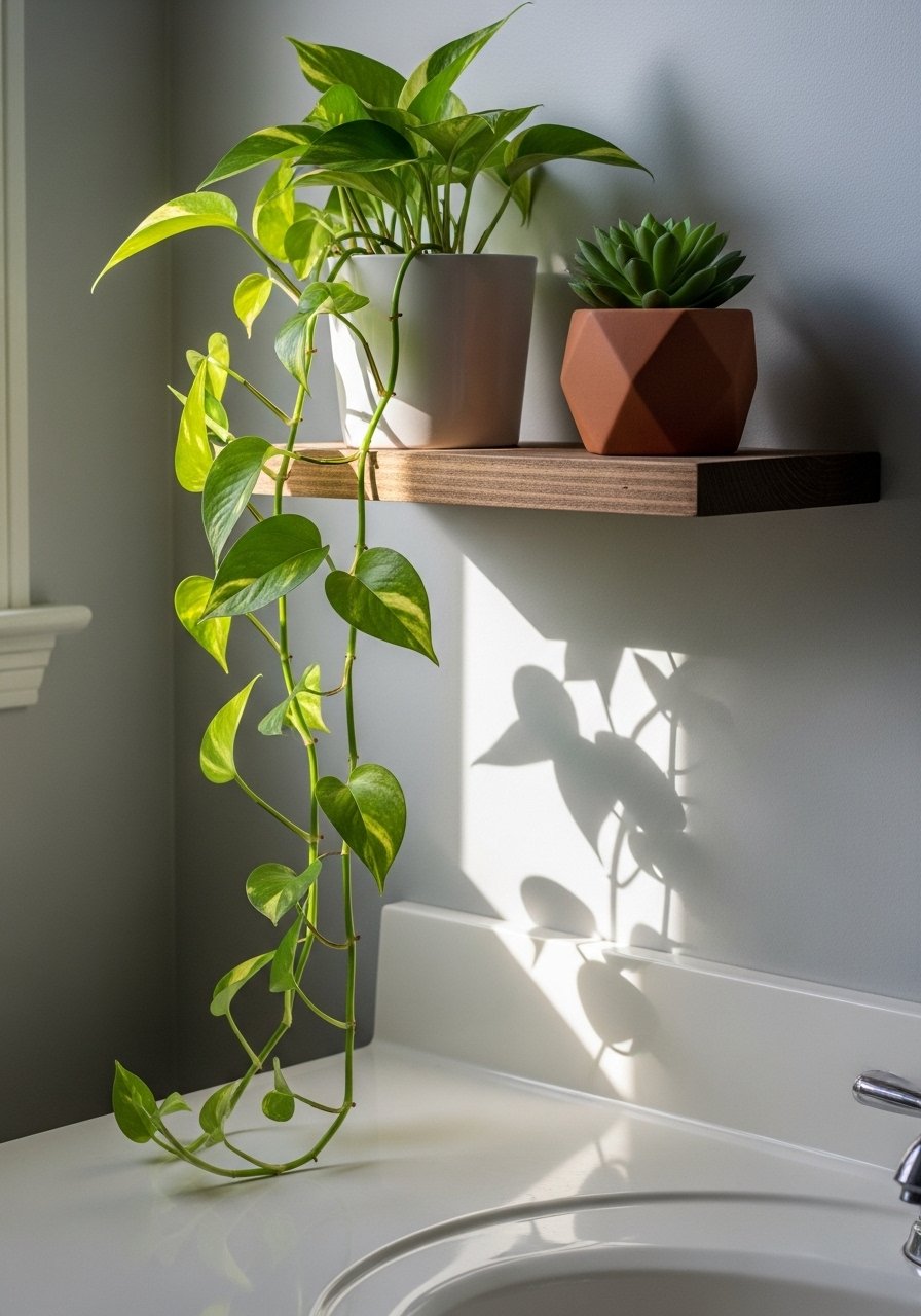A slim wall shelf with trailing plants adds life without using countertop space. I mount mine about 12 inches above the mirror top so the plants cascade naturally. Budget $20-$50. The common error is overwatering which spots the mirror. Use real plants that tolerate humidity like pothos, or a realistic faux pothos. For low-light bathrooms select faux options. Plants help soften mirrors and hardware.