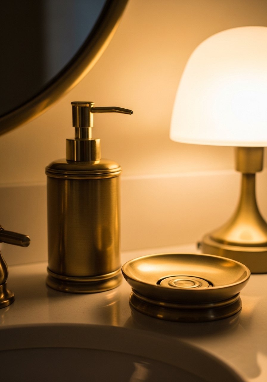 Matching dispensers make the counter feel intentional. I match the soap pump to a soap dish and toothbrush holder to create a small set. Budget $15-$40. A common mistake is mixing shiny new pieces with old tarnished fixtures. Either refresh hardware or pick matte finishes that hide water spots. I use a brass soap dispenser pump. In rentals choose pump finishes that complement existing taps.