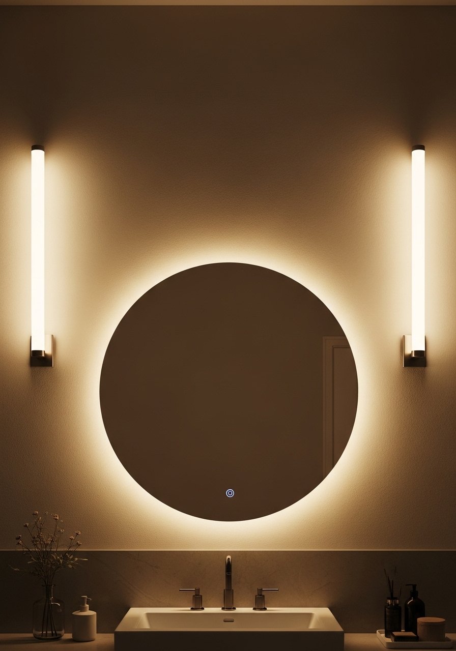 Slim LED sconces eliminate shadows on the face. Place them at about eye level, 66 inches from the floor on both sides of the mirror. Budget $40-$150 per pair. The error is placing lights only above the mirror. That creates downward shadows. I used LED vanity strip lights warm white to fill in. In bathrooms with low ceilings choose lower-profile fixtures.