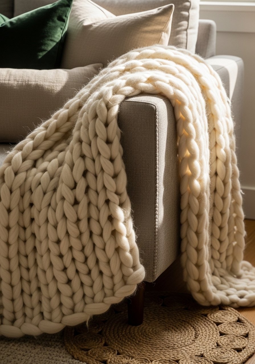 I layered linen, velvet, and chunky knit on my sofa to break up beige without adding bright color. I used this cream chunky knit throw and paired it with 22-inch linen euro pillows and velvet covers in camel tones. The result feels warm and tactile. Avoid matching all fabrics—contrast matte linen with a subtle sheen. Mixing textures makes beige read intentional, not boring. I find odd numbers (3-5 pillows) look balanced.