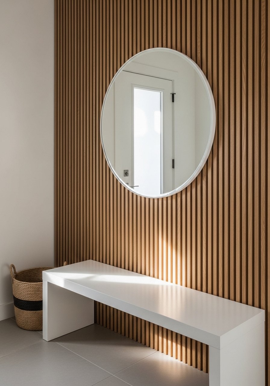 I installed a narrow white oak slat wall behind my entry bench to add depth to beige walls. A 36-inch round mirror reflects light and doubles the impact. Warm wood tones feel current in 2026 and keep beige from looking washed out. Don’t go dark—choose warm oak instead of walnut in small spaces. The wood anchors shoes and bags, and the result reads layered and welcoming rather than flat.