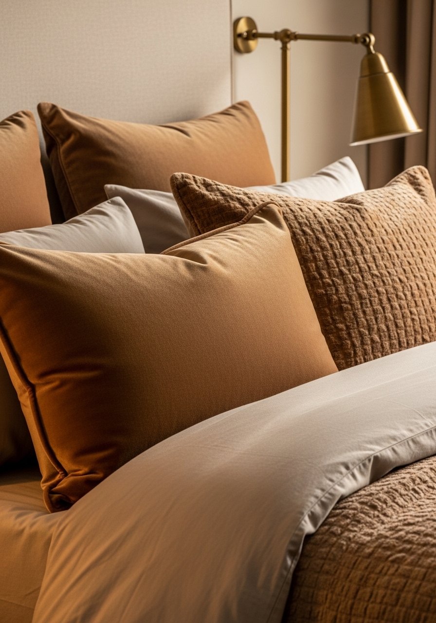 Velvet adds depth to beige without bright color. I swapped out cotton pillows for velvet pillow covers in warm taupe and paired them with brass lamps. Mixing brass with brushed nickel on hardware keeps the look updated. Common mistake: overusing the same metal—mix two finishes and keep them balanced. Velvet reads luxe but is still cozy in low light. This combination makes beige feel elegant, not bland.