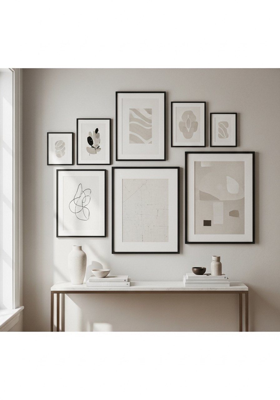 A curated gallery wall in black frames cuts through beige and adds modern contrast. I thrifted frames and used fresh white mats for a high-end look. These mixed black frames provide structure without adding color. Common mistake: spacing frames unevenly—stay consistent with 2-3 inch gaps and vary sizes for rhythm. Gallery walls work in living rooms and staircases and read more intentional than a single oversized print in a sea of beige.