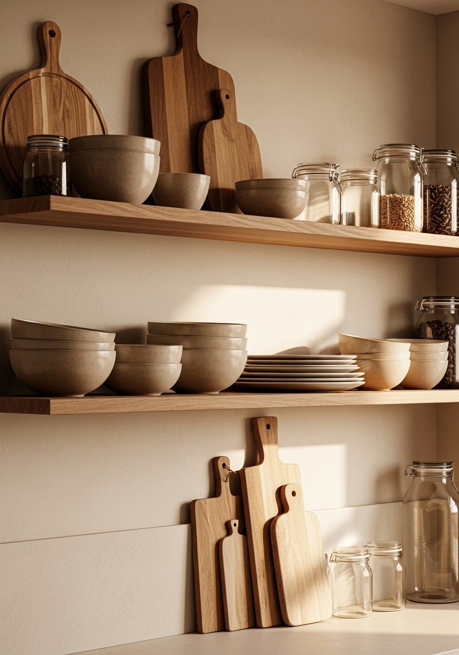 Open shelving in beige kitchens keeps the palette calm and warm. I swapped some upper cabinets for shelves and displayed beige stoneware and warm wood boards. This makes the kitchen feel edited and accessible. Mistake to avoid: mismatched, cluttered dishes—edit to 8–12 items per shelf for a gallery-like look. Matte ceramics and brass hardware offer subtle contrast without breaking the warm neutral language.