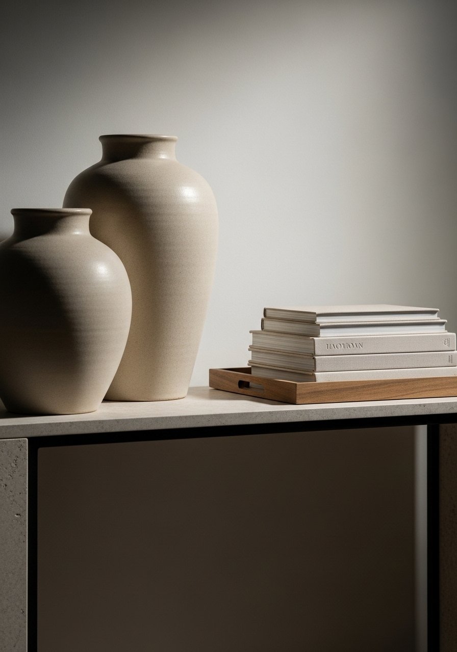 Sculptural ceramics add artful weight to beige spaces. I placed two statement beige vessels on my console and a small stack of books for scale. Ceramics offer organic shapes and matte surfaces that play nicely with linen and rattan. Don’t scatter lots of small objects—choose 1–3 larger pieces to read intentional. The result feels curated and calm, bringing a tactile focal point that keeps beige from feeling empty.