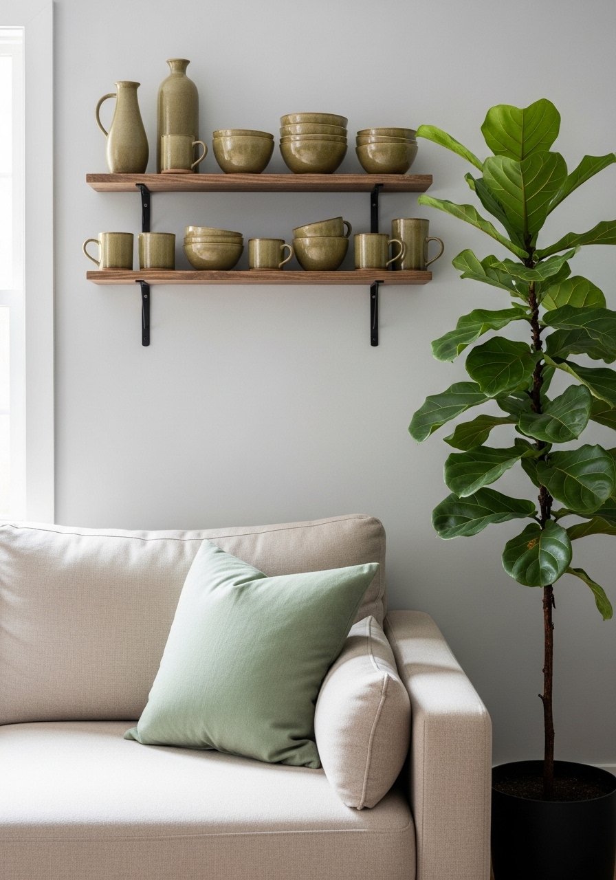 I paired sage green with beige for a gentle, natural combo. A few olive ceramic pots and a 6-foot fiddle leaf fig (real if you prefer) add life and a cool counterpoint to warm neutrals. Mistake to avoid: overdoing green—use one accent color across 10–20 percent of the room. The green reads fresh and grounded next to beige, enhancing a calm, organic vibe.