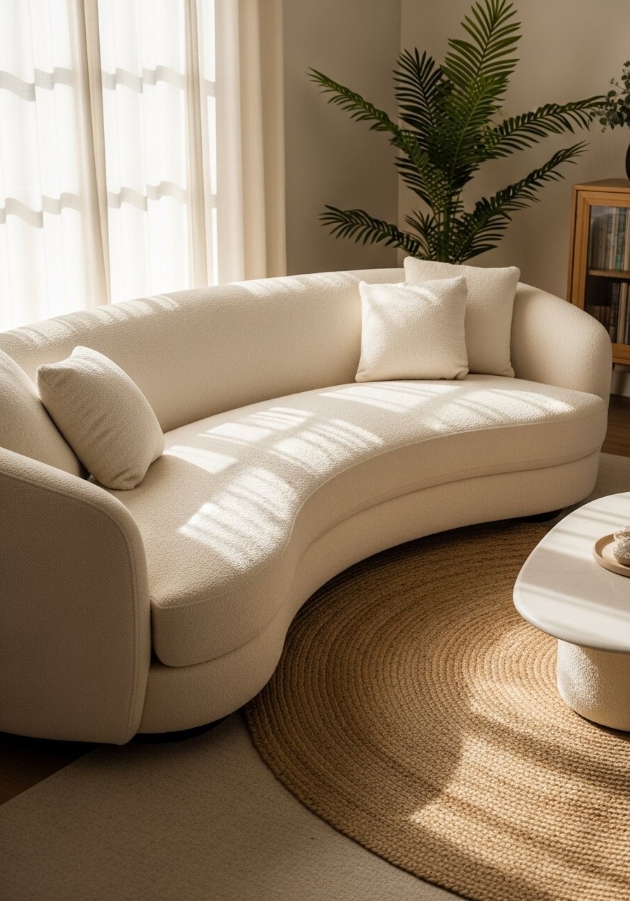 A curved cream sofa softens angles and reads modern against beige walls. The rounded shape adds a sculptural element while remaining cozy. Pair it with wooden legs and warm-toned pillows to avoid a floating look. Mistake: choosing a sofa that’s too low—ensure back height complements the room. Curved silhouettes feel current in 2026 showrooms and pair well with rattan lighting and brass accents for a lived-in, modern feel.