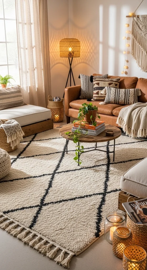 Layering rugs is one of the easiest boho tricks. Start with a simple jute or flat-weave rug as your base. These are affordable and easy to find online or secondhand. Place a smaller patterned rug on top to add depth. The contrast creates visual interest without clutter.