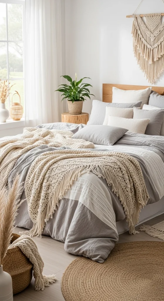 Layer bedding using simple pieces. Start with neutral sheets. Add a textured quilt and a throw.