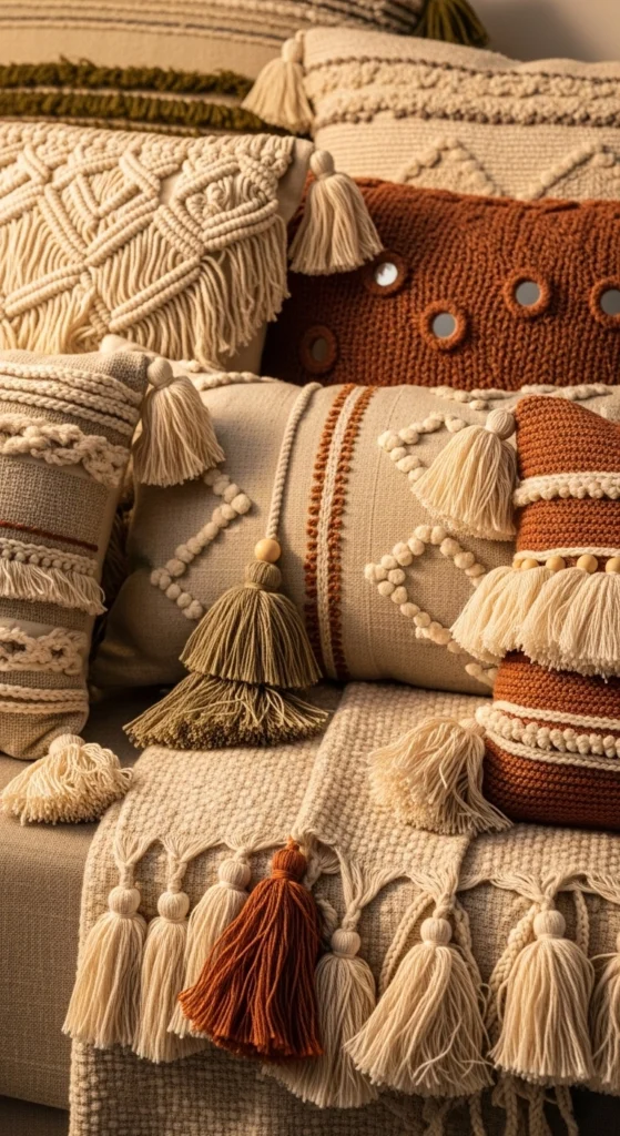 Limit to a few pieces so they feel intentional. Neutral tassels age well.