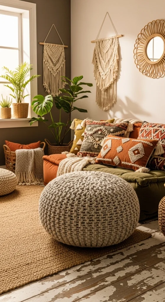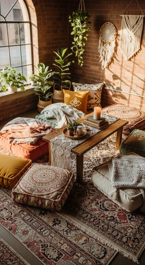Low seating creates a relaxed feel. Use floor cushions or poufs.