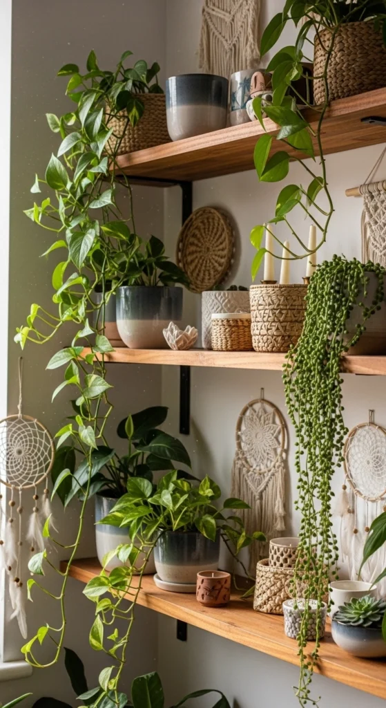 Trailing plants soften shelves. Use pothos or philodendron.