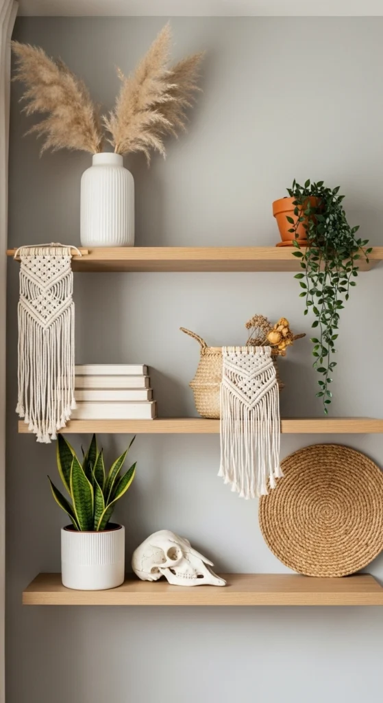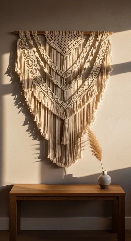 Macramé brings texture without taking up floor space. A single wall hanging can fill an empty wall and soften sharp edges. You can buy affordable options online or try a simple DIY kit.