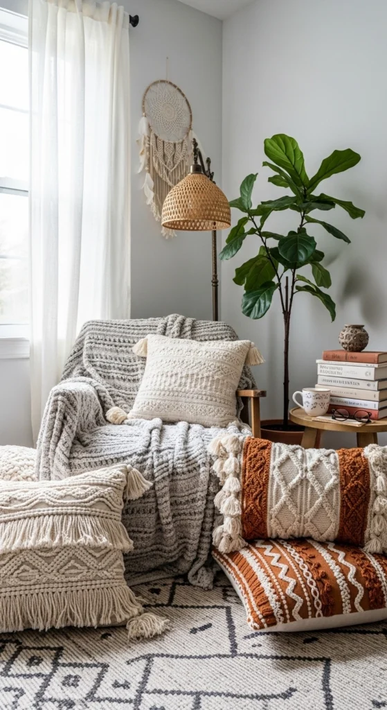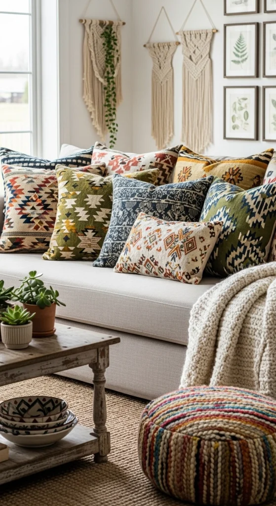 Throw pillows are an easy swap. Choose covers with tribal or geometric patterns. Stick to a shared color family to avoid chaos.