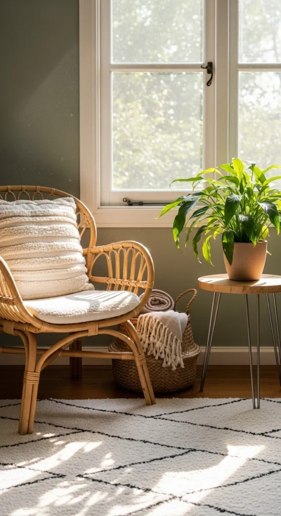 Look for secondhand pieces or simple designs. Even slightly worn rattan works. Add a neutral cushion or throw for comfort. Keep surrounding decor light so the chair stands out.