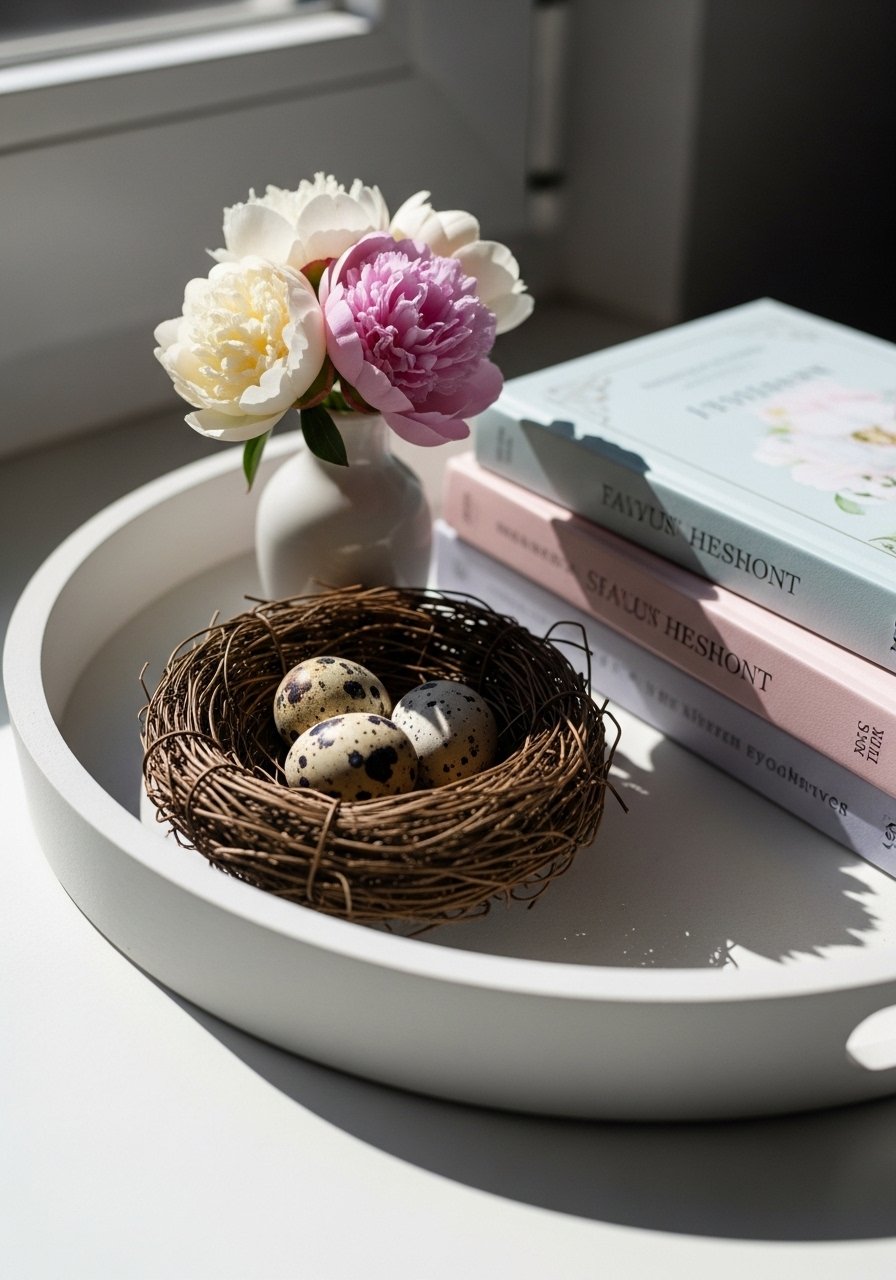 I keep one tray for seasonal swaps. In spring I add a small nest and a vase of peonies; in winter I drop in pinecones and a tall candle. Swapping a couple of items keeps the console feeling updated without a full redo.