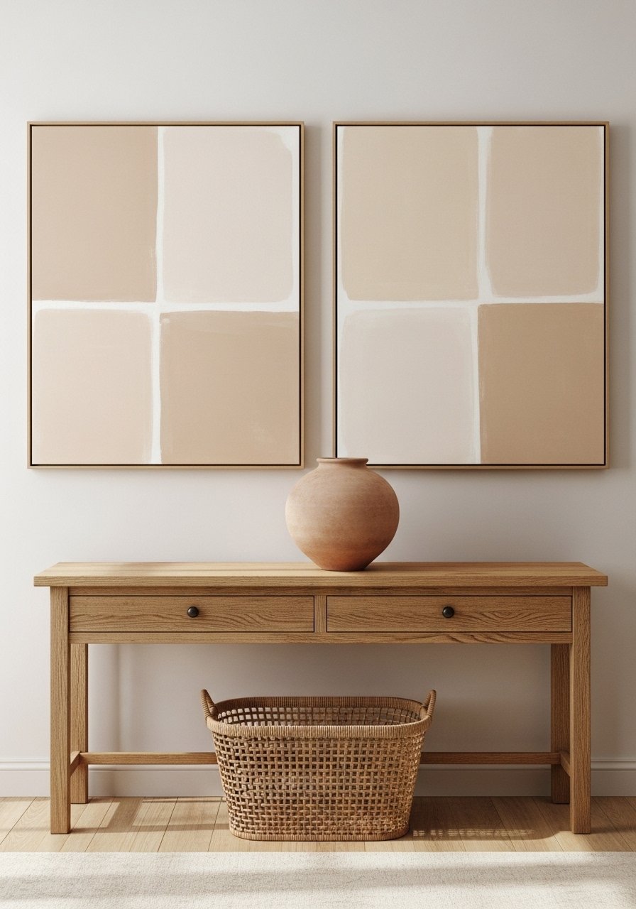 I painted a cheap pair of canvases in oat and clay and hung them above the console. The diptych echoed the tabletop vases and instantly made the vignette feel intentional. Earth tones are quieter and help other textures pop.