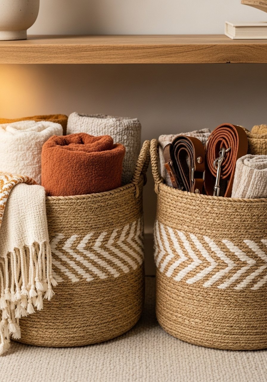 Choose baskets that are slightly smaller than the shelf depth so they slide easily. I made the mistake of buying awkwardly tall baskets once — they stuck out. Low and wide feels cleaner.