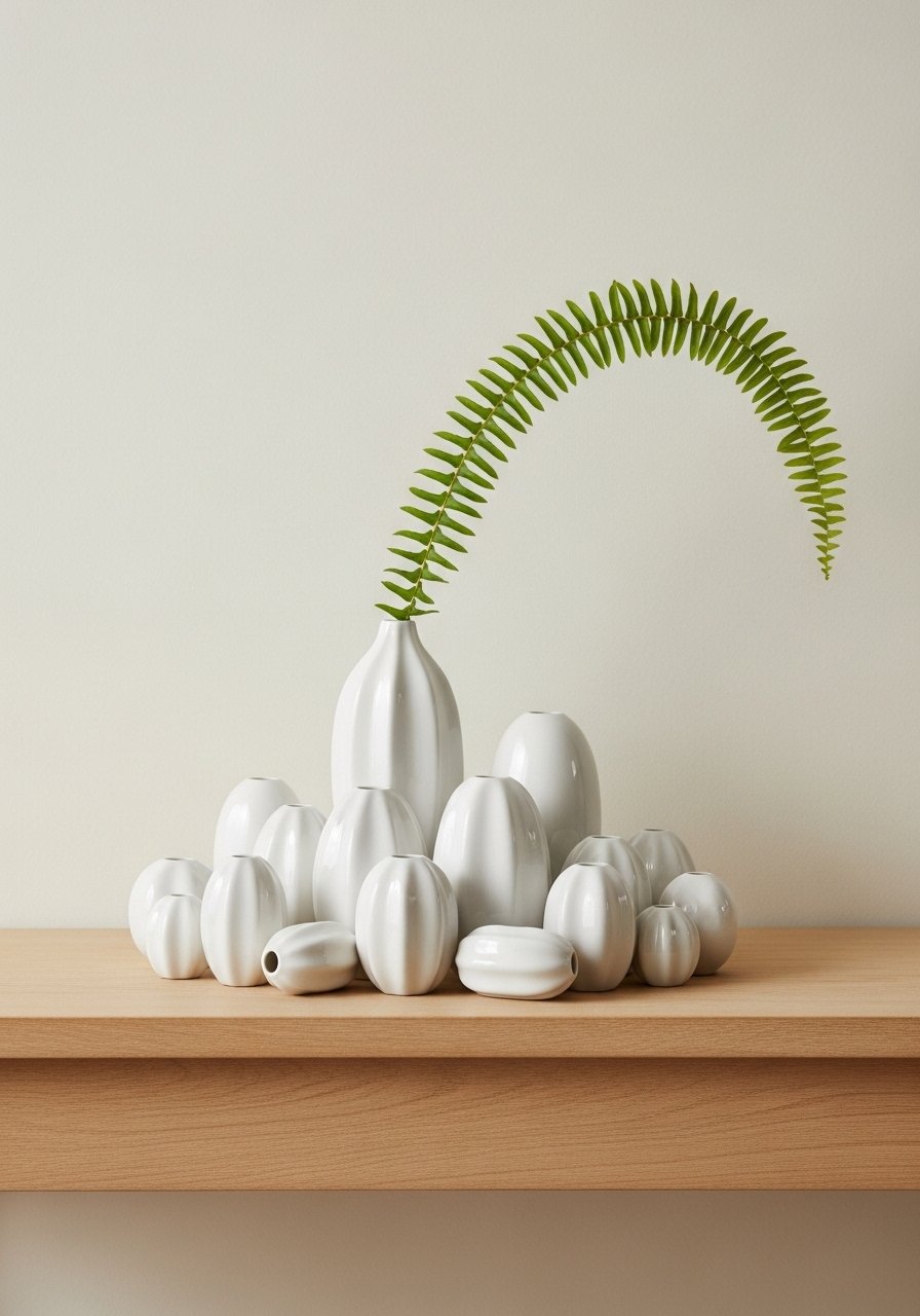 I started buying small china pods and pairing one with a fern frond. It’s a soft, unexpected hint of green that feels fresh. The pods catch the light and add a soft, glossy contrast next to linens.