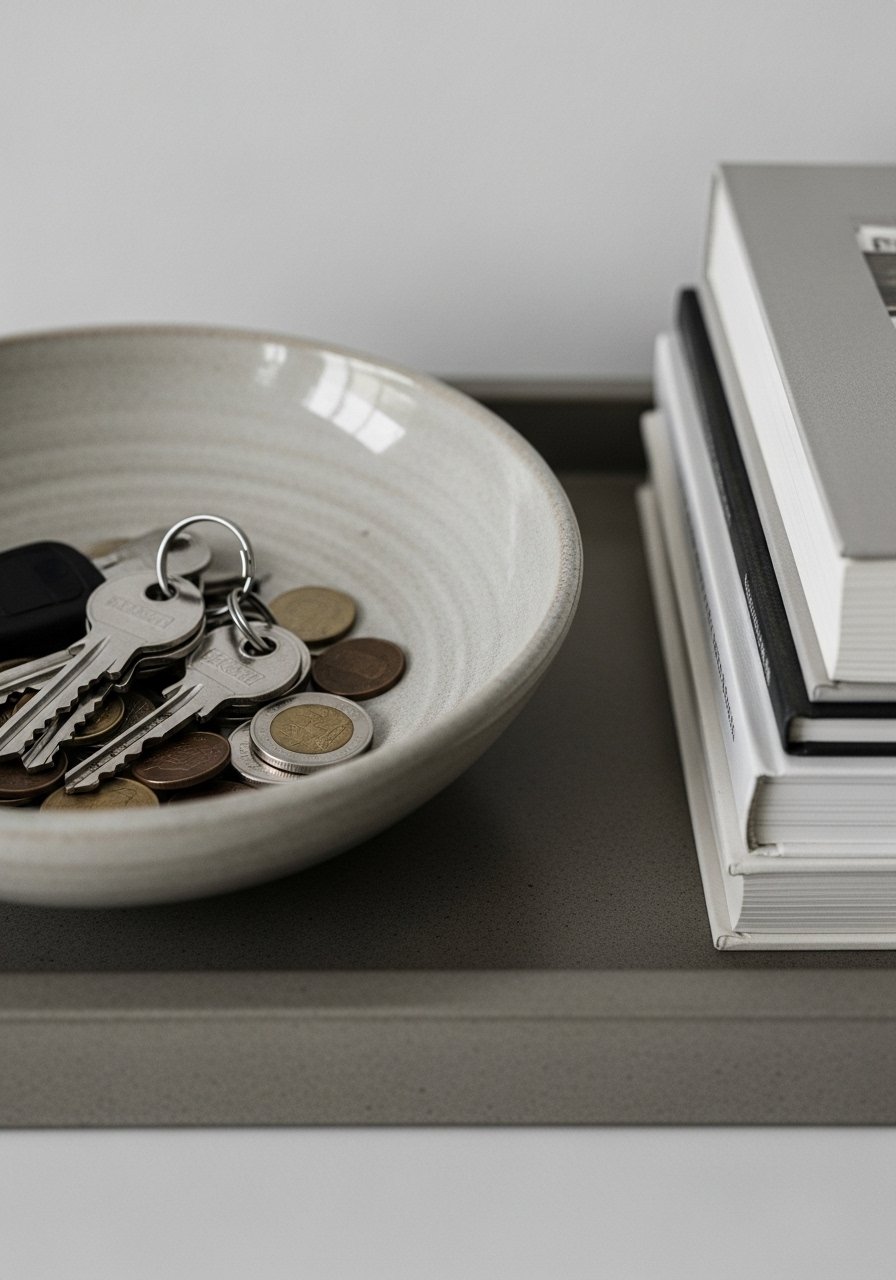 A shallow ceramic bowl is the single thing that made me stop losing my keys. It’s easy to decorate around and keeps daily clutter tidy. I move the bowl from the tray to the console depending on need.