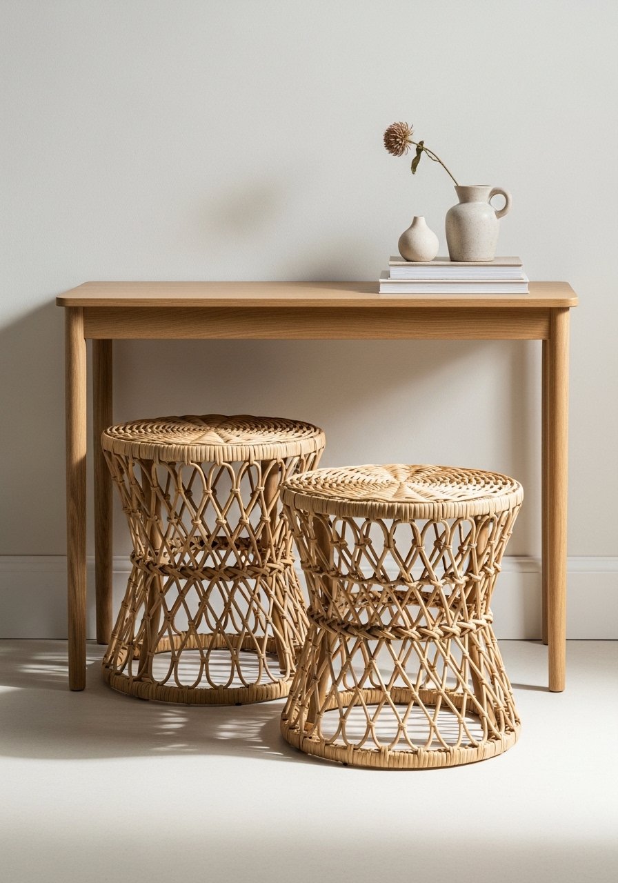 I tuck two small rattan stools under my console for quick seating. They’re handy and look deliberately stored rather than crowding the floor. The rattan warms the oak console and keeps the palette soft.