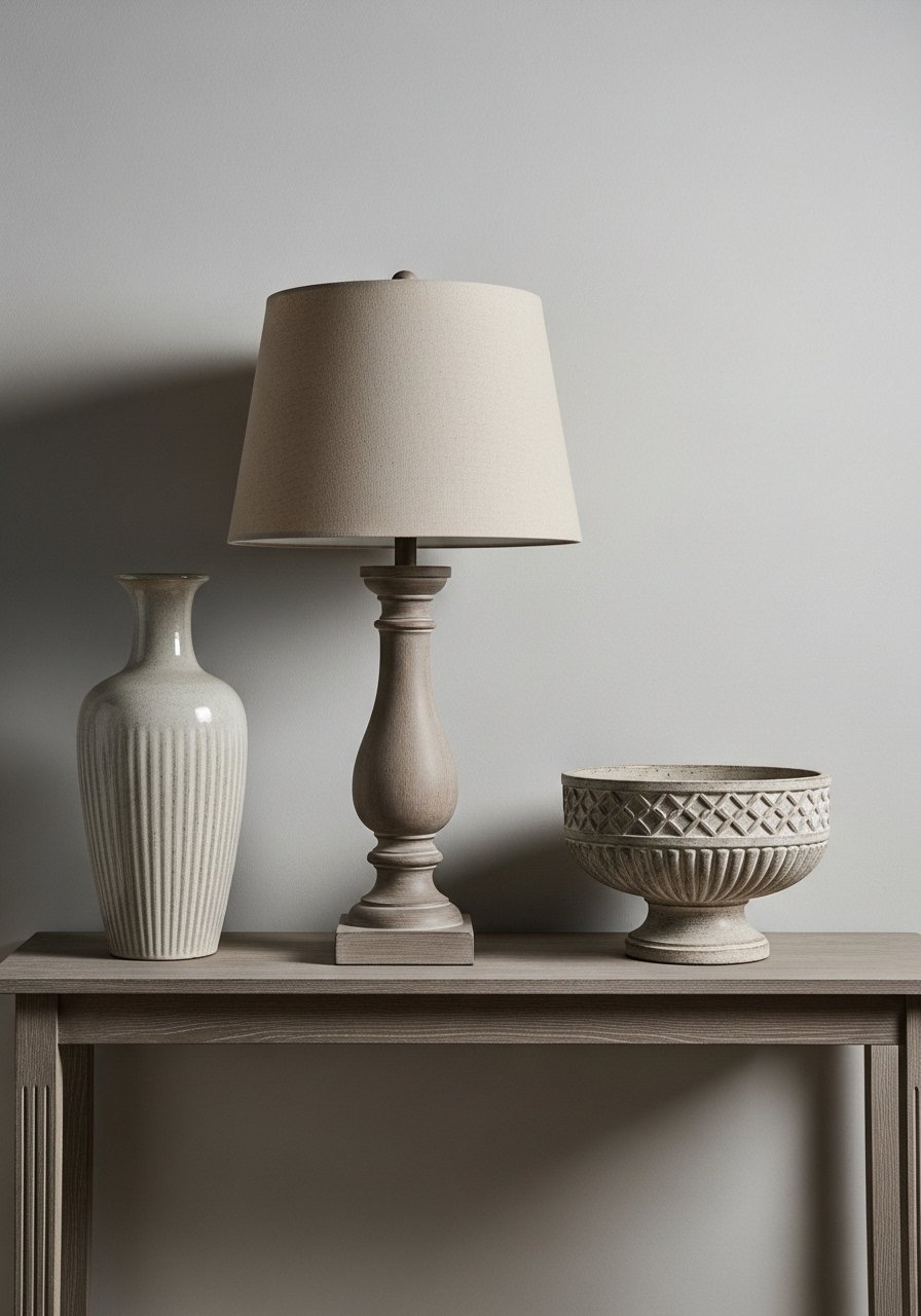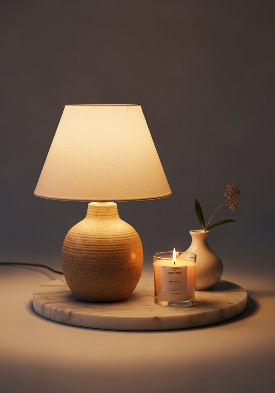 I once chose a glossy lamp that clashed with linen textures. Matte ceramic reads calmer. Keep metals repeated twice for cohesion — lamp base and a small brass match striker, for example.