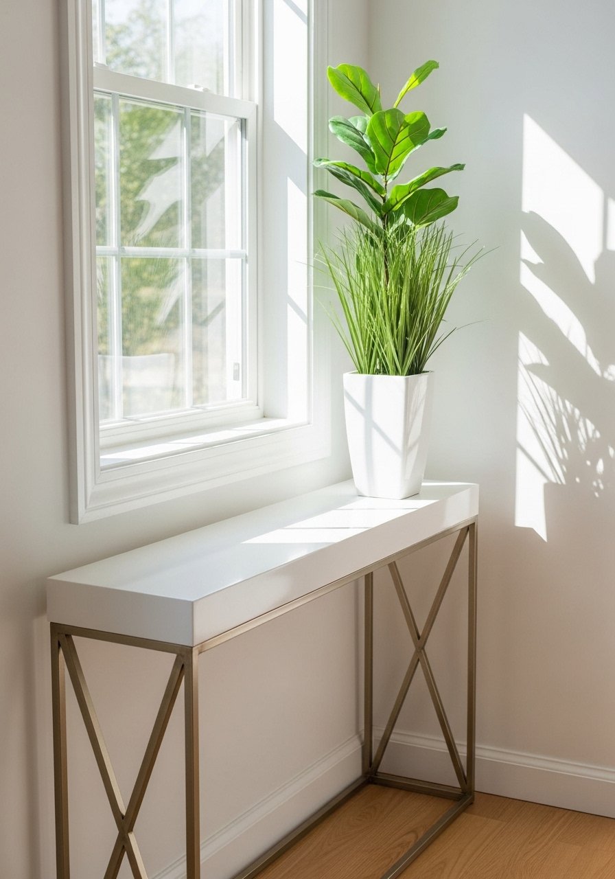 I learned to keep circulation at least 30 inches. The slim console reads intentional and gives just enough shelf for essentials. Real plants with narrow leaves work best in this setup.