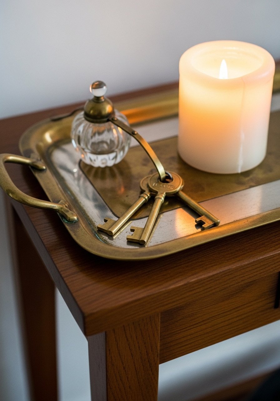 I hunt thrifted trays and use one to collect daily items. A vintage brass tray disguises scratches and looks collected. It organizes keys, mail, and a small flashlight so the surface reads tidy.