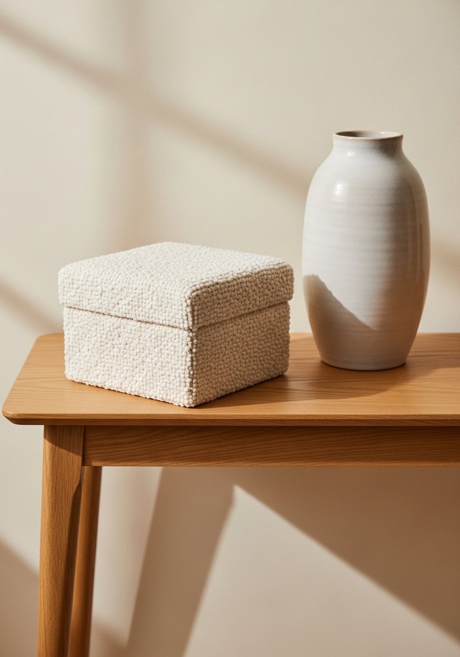 I added a small bouclé-covered box to my console for softness. The fabric contrasts with harder ceramics and wood, which makes the surface feel layered. The box also hides small papers I don’t want on show.